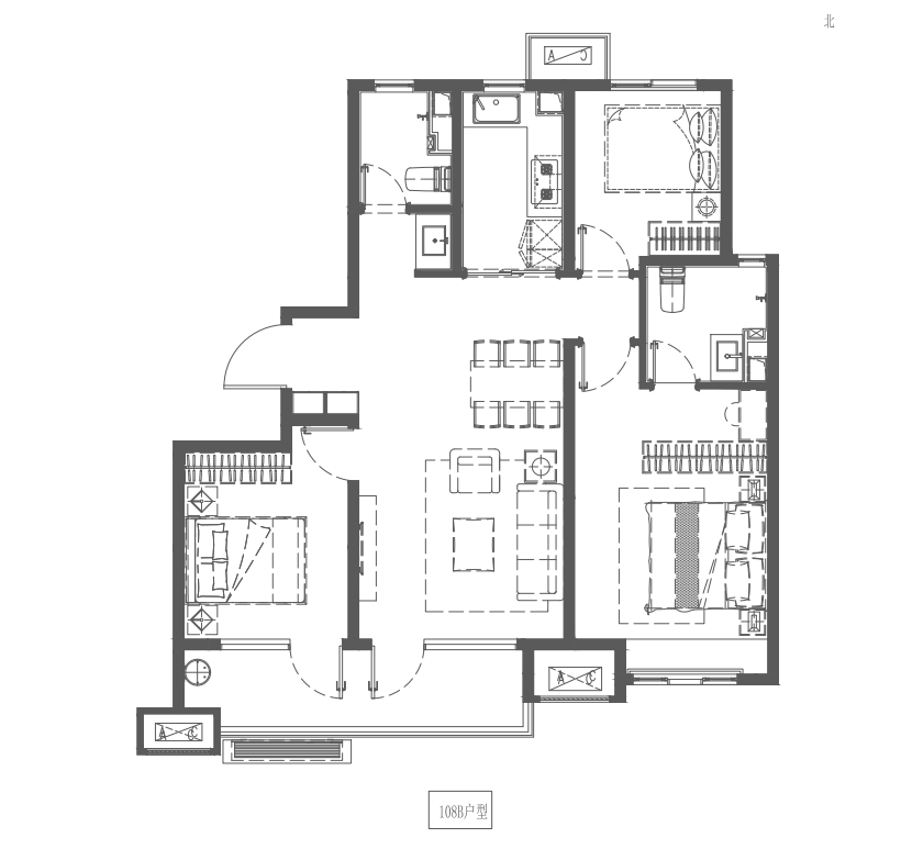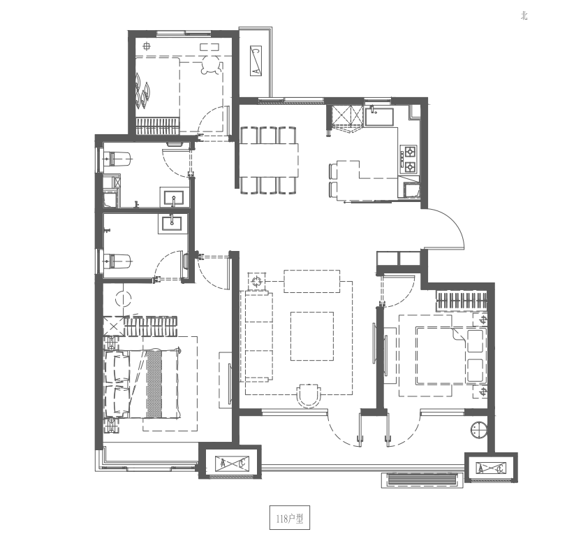 独立玄关入户,阔绰餐客一体 南次卧拥揽步入式敞开阳台 主卧独卫套房,奢享优雅衣帽间 明窗北卧,随心百变,全龄陪伴 L型厨房,美味时光自由生长 客卫干湿分离,乐享私密美好